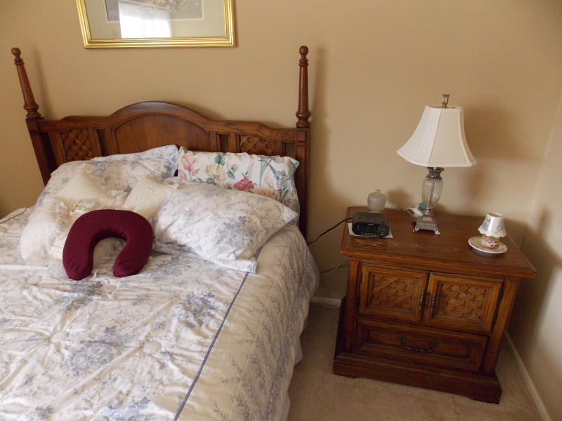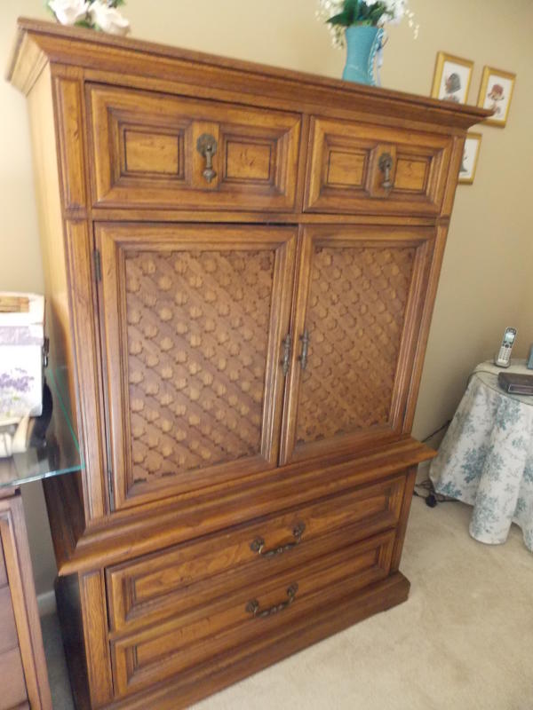 Queen Anne & rattan chairs, ottoman, sofa & hide a bed, dining table, entrance table, Japanese kimono rack, mirror, coffee & end tables, walnut drop front secretary, oak china cabinet, table w/6 chairs & curio cabinet, 4 pc. oak bedroom set, Pfaff Synchrotonic 1229 sewing machine w/hobby lock, wrought iron patio set, Kimball spinet piano, etc.