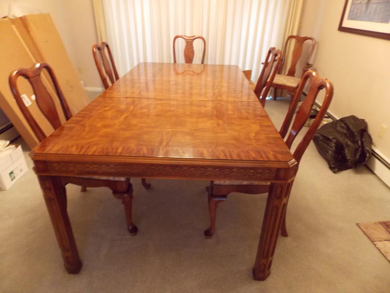 Pair of vintage ornate end tables, oak dressing table, corner chair, Century dining table w/6 chairs & china cabinet, 2 Ashley sofas, sofa table, 4 drawer dresser, occasional tables, oak filing cabinet, etc.