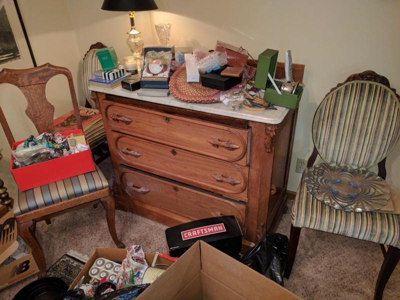 Man of North chairs, slat back rockers, oak fern stands, secretary desks, rustic chairs, drop leaf table, Eastlake dresser, numerous occasional chairs, western foot stool, octagon parlor table, ornate end tables, wicker, painted cupboard, numerous painted pieces, 3 drawer Victorian dresser, 2 oak storage cabinets, sleigh bed, 2 barrister bookcases, Victorian parlor tables & hall mirror, drop front secretary, picture frames, pie safe, oak dressers, etc.