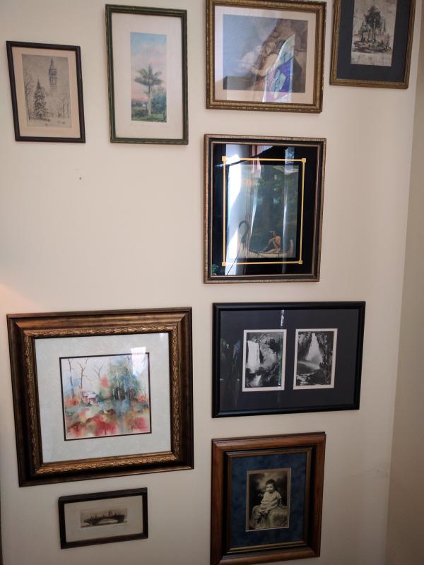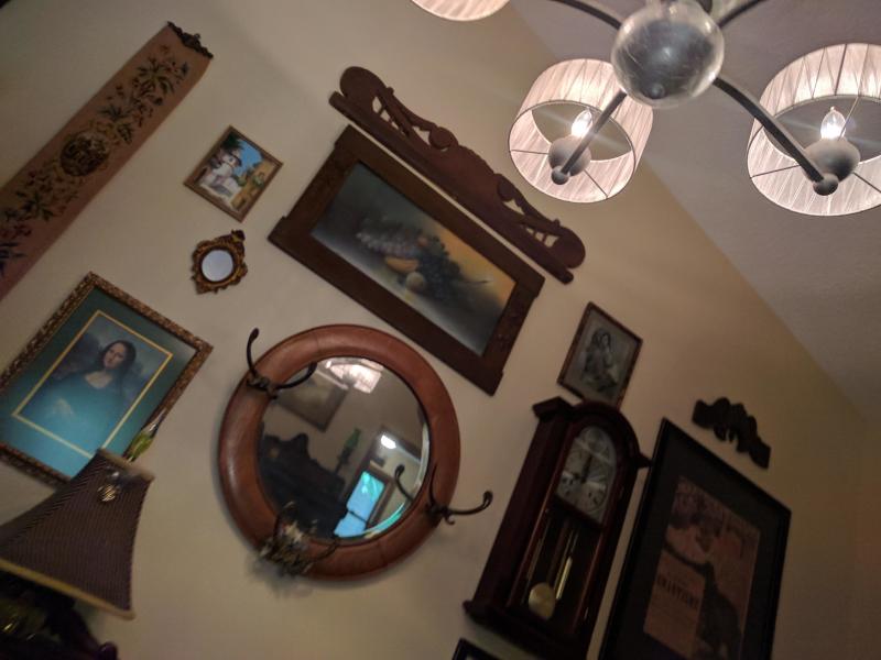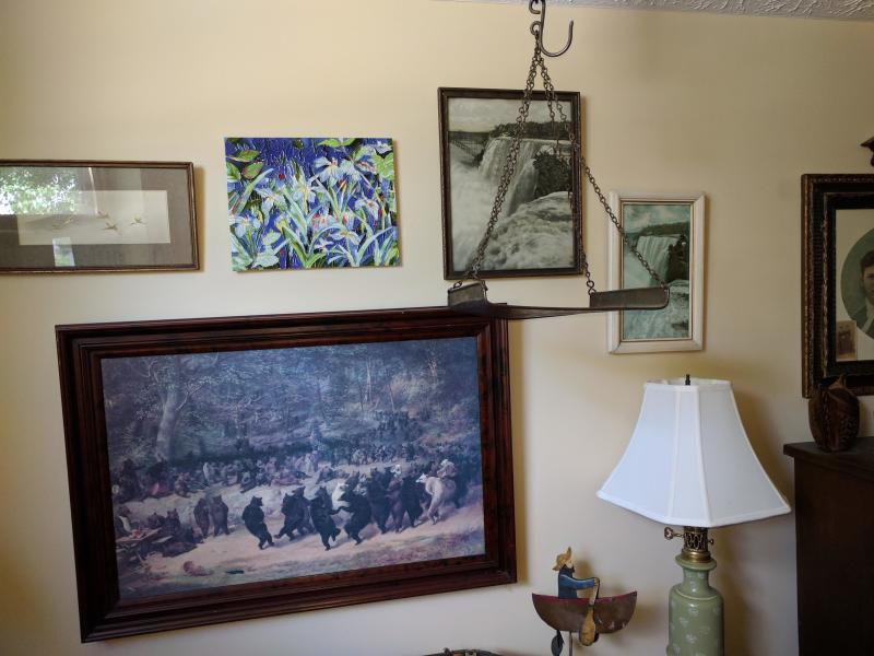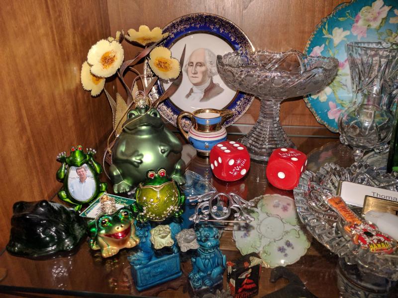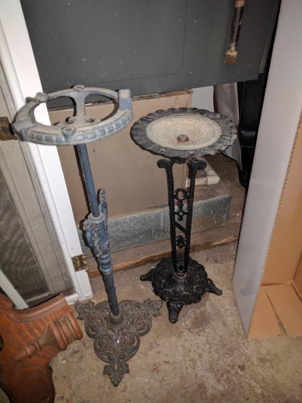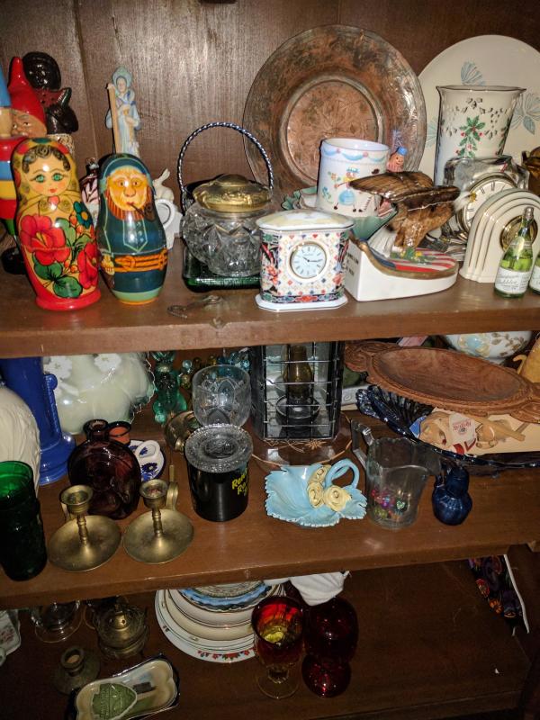 Panel lamps, stained glass windows, New Haven clock, crocks, cast iron door stops, Matchbox cars, banquet lamps, numerous oils & prints, old fans, cast iron banks, paperweight collection, posters, pastel chalks, copperware, life-sized cast iron bust of Hermes, marble pedestal, turquoise jewelry, kerosine lamps, Pewterware, ash receivers, 6’ totem pole, gumball machine, spinning wheel, cast bookends, vintage safe, etc.